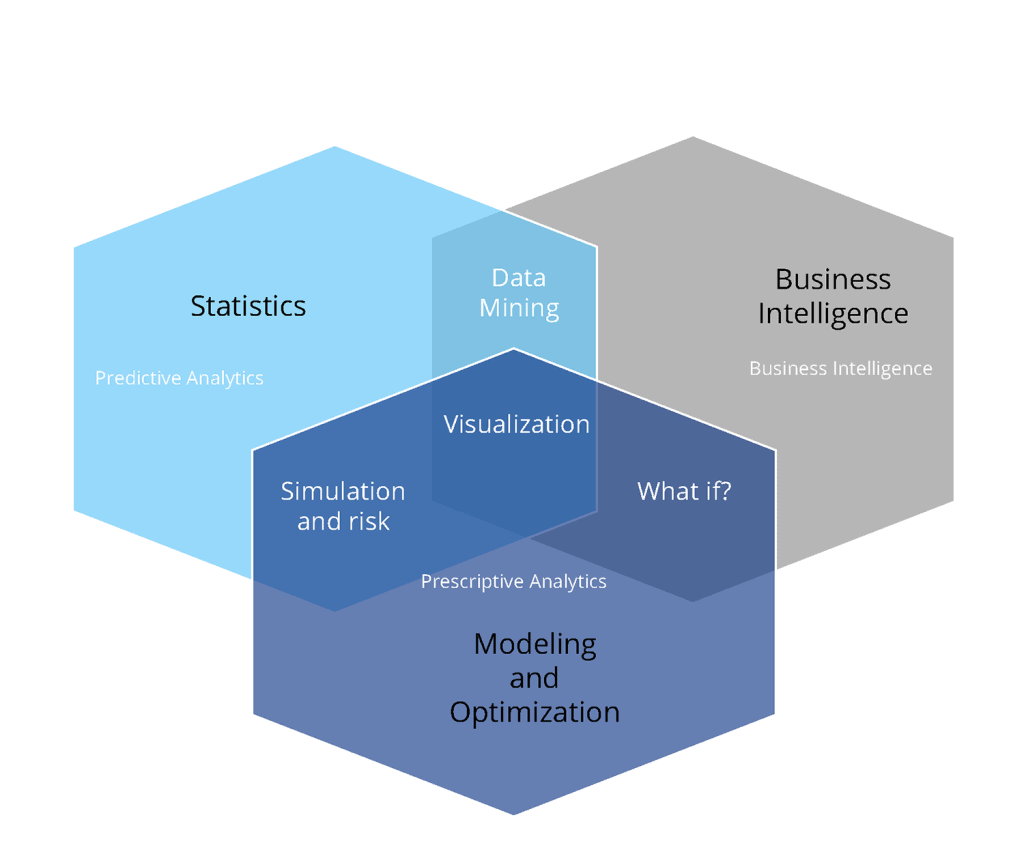 Während sich bei Business Intelligence (BI) alles um Data Mining, Visualisierung und mündlichen „Was wäre wenn?“ Analysen dreht, werden bei Predictive Analytics Algorithmen in Form von statistischen Grundsätzen zusätzlich betrachtet und computerunterstützt berechnet. Prescriptive Analytics greift die „Was wäre wenn?“ Analyse und die Simulation auf und versucht, durch Visualisierung der Daten sowie parametrisierten Änderung, die Zukunft vorherzusagen und nach der eigenen Unternehmensvision und -strategie zu optimieren.