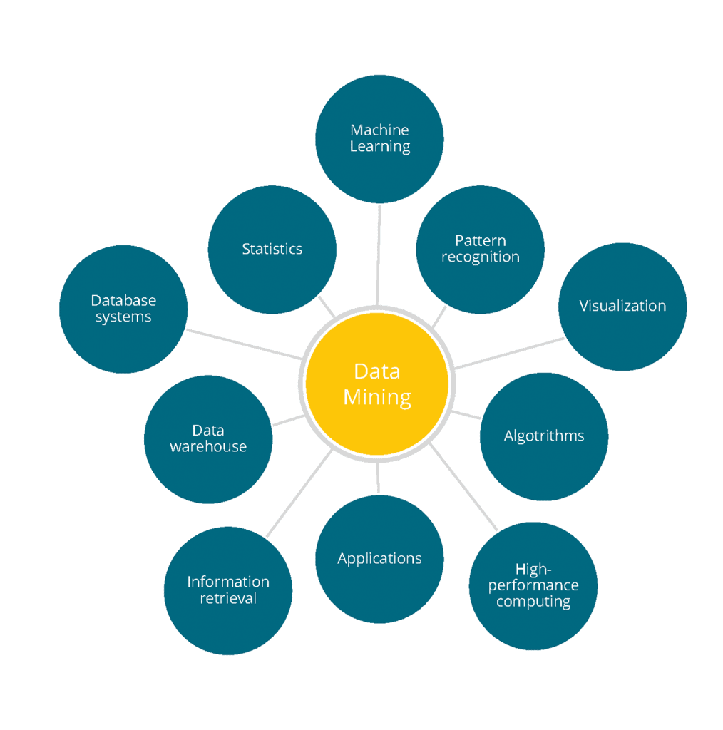 Die technische Entwicklung fördert verschiedenste Ressorts. Datenbanksysteme entwickeln sich ständig weiter und können immer mehr Kapazitäten an Datenmenge effizient speichern. Es werden neue Algorithmen entdeckt oder aufgesetzt, die mit vorherigen technischen Mitteln nicht umgesetzt werden konnten. Data Mining (DM) wird als Prozess angesehen, der Rückschlüsse und Muster aus großen Datenmengen generieren soll. Dieser Vorgang beinhaltet Datenaufbereitung, Datenintegration, Datenselektion, Datentransformation, Mustererkennung und Validierung, sowie die Präsentation der Erkenntnisse. Dabei wird das Data Mining von vielen verschiedenen Bereichen beeinflusst, wie die folgende Abbildung zeigt.