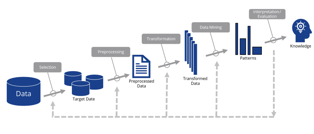 Der Datenfluss dieses Prozesses beginnt bei den erworbenen Daten aus einer oder mehreren Datenquellen. Diese werden dann in einem Data Warehouse konsolidiert und anschließend mit DM Funktionen prozessiert. Daraus geht ein erkanntes Muster hervor, auf Basis dessen der Nutzer Wissen generieren kann. Die Charakteristiken von DM kommen im Datenfluss an allen Stellen zum Tragen. Im ersten Schritt auf Datenbankebene werden die Daten bereinigt und integriert. Anschließend werden die relevanten Daten selektiert und in eine Zielstruktur transformiert, welche für das DM von Bedeutung ist. Aus dem DM ergibt sich ein Muster, welches evaluiert und dem Endnutzer präsentiert werden muss. Dieser kann das Muster als Grundlage für Wissen verwenden oder bei fehlgeschlagener Evaluierung verwerfen. Im Prozess kann jeweils bilateral sowohl auf den Folgeschritt als auch auf den vorherigen Schritt zur Verbesserung gegangen werden. Für Unternehmen ist es wichtig ein konsolidiertes Datenmanagement trotz teilweise verteilter Systemlandschaften hinzubekommen. So können Daten effizient verknüpft und ggf. Muster erkannt werden. Beispielsweise können die ERP Daten mit den Daten aus einem firmeneigenen Onlineshop abgelegt werden, um zu prüfen, wie viele Kunden tatsächlich einen Kauf abschließen und vice versa wann der Kunde den Kauf abbricht. Eine Kombination dieser heterogenen Datenquellen hat für die weitere Erkundung nach Mustern großes Potential.