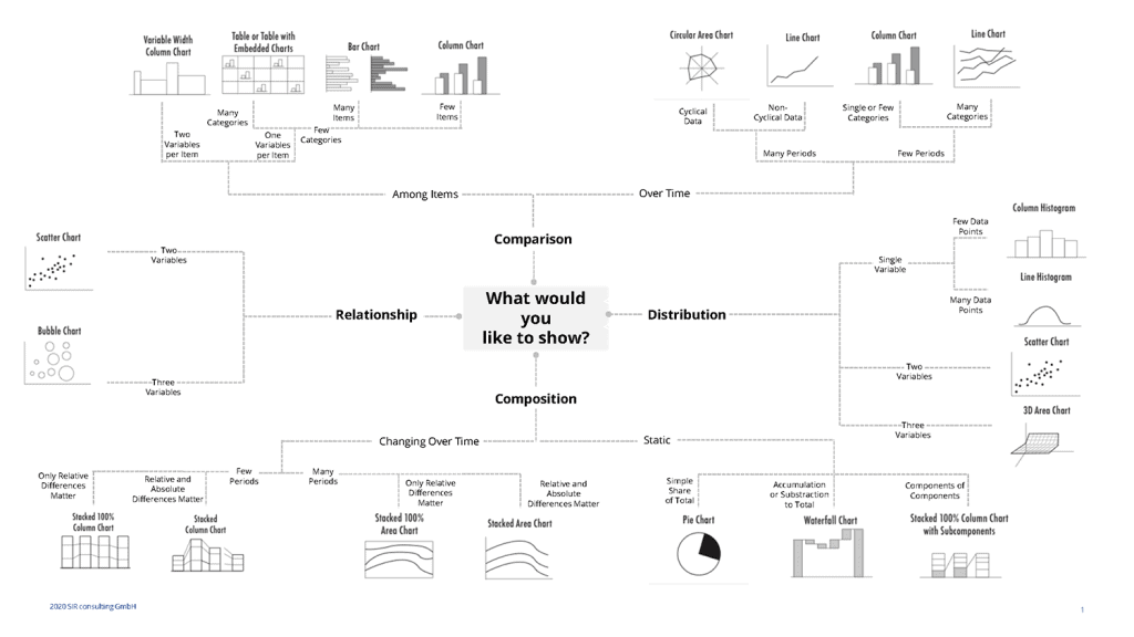 Meistens im Fokus stehen die Beziehung (Relationship) und Verteilung (Distribution) der Daten.