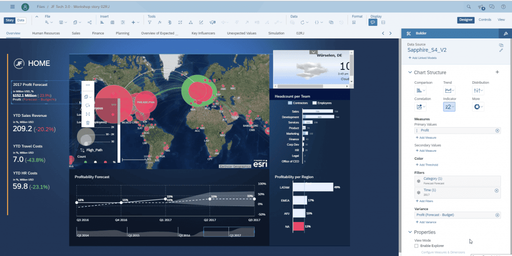 Eine weitere Komponente der SAP Analytics Cloud ist der Digital Boardroom – ein Cockpit für die systemintegrierte Aufbereitung von Abschlusszahlen, das für Präsentationszwecke eingesetzt wird. Mit der Nutzung des Digital Boardroom entfallen aufwendige Aufbereitungen von Präsentationen. Insbesondere, wenn das Zahlenmaterial eine erneute Aktualisierung erfährt, sind häufig sehr kurzfristige Korrekturläufe in den Unterlagen notwendig, was den Mitarbeiter nicht selten Schweißperlen auf die Stirn treibt. Das Tool ist somit ein weiterer Baustein hin zum papierlosen Prozess. Die eigentliche Präsentation wird innerhalb des SAP Digitial Boardroom erstellt, erforderliche Daten in die Präsentation integriert und in Echtzeit visualisiert. Es ist jedoch auch möglich die Realtime-Funktion abzuklemmen, um bspw. für einen bestimmten Präsentationstermin ein zuvor vorbereitetes und abgestimmtes Ergebnis zu zeigen, welches ggf. parallel auch in anderen Medien präsentiert wird. Wie genau die Ausgabe der Zahlen erfolgt, kann selbstverständlich unternehmensindividuell definiert werden. Mit der Definition einer eigenen „Story“ können verschiedenen Verantwortlichen unterschiedliche Teile der Präsentation zugewiesen werden, um somit einen professionellen und strukturierten Ablauf bspw. von Gremiumssitzungen sicherzustellen und digital zu unterstützen.