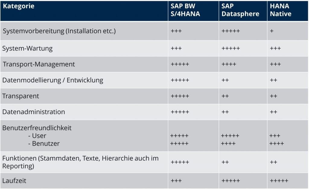Insgesamt hängt die Wahl zwischen SAP BW/4HANA, SAP Datasphere und HANA Native von den individuellen Anforderungen und Ressourcen Ihres Unternehmens ab. BW/4HANA bietet umfangreiche Funktionen für umfassendes Datenmanagement und -analysen, Datasphere erleichtert die Datenintegration, und HANA Native bietet maximale Flexibilität und Leistung, erfordert jedoch spezialisiertes technisches Know-how. Eine sorgfältige Analyse Ihrer Geschäftsanforderungen ist entscheidend, um die richtige Entscheidung zu treffen, bei der wir Ihnen sehr gern behilflich sind!