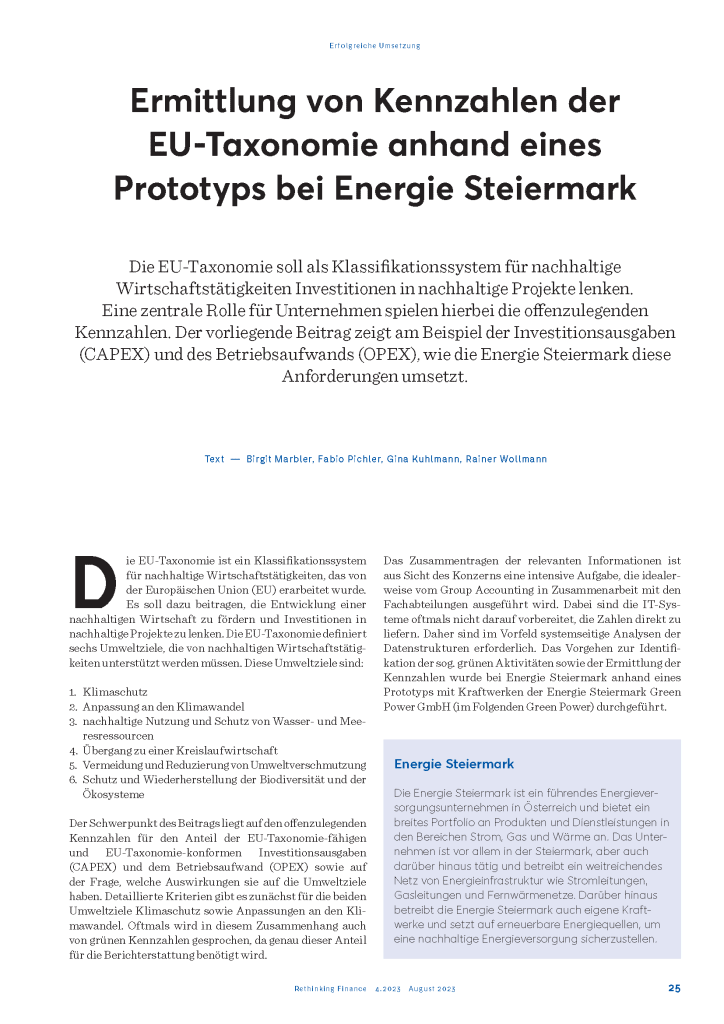 Publikation in REthinking: Finance „Ermittlung von Kennzahlen der EU-Taxonomie anhand eines Prototyps bei Energie Steiermark“