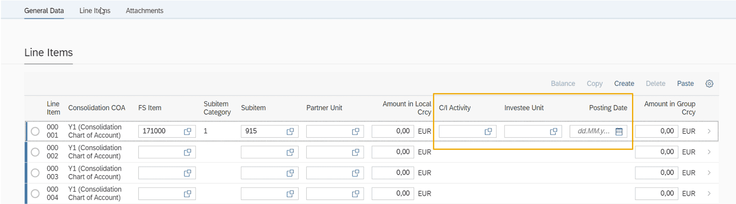 - Diese Felder sind für alle Kontierungsebenen verfügbar, die mit Apps für manuelle Buchungen verbunden sind (01, 10, 20, 30), aber diese Felder sind nur für FS-Items vom Typ Beteiligung und / oder Eigenkapital möglich / inputfähig.