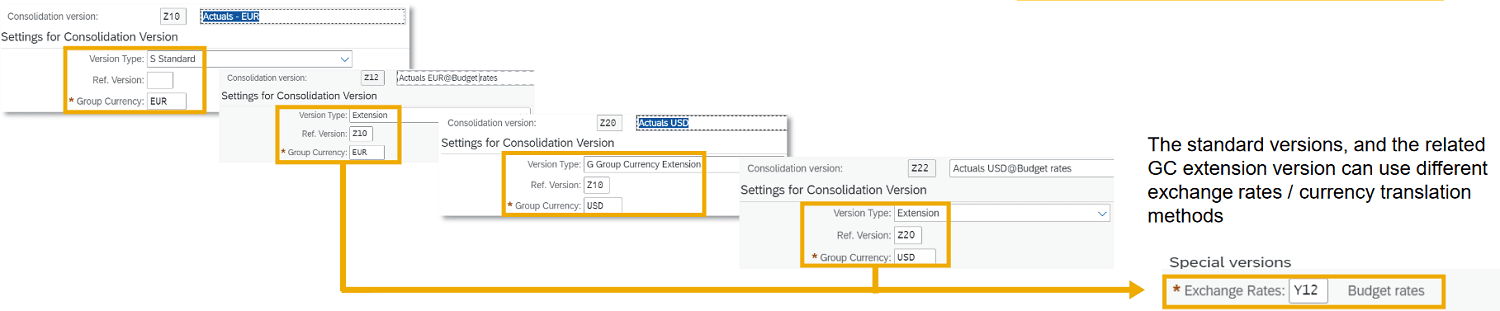 Mit dem neuen Ansatz zur Simultankonsolidierung in mehreren Konzernwährungen und/oder unter Verwendung unterschiedlicher Umrechnungen werden Versionstypen eingeführt: