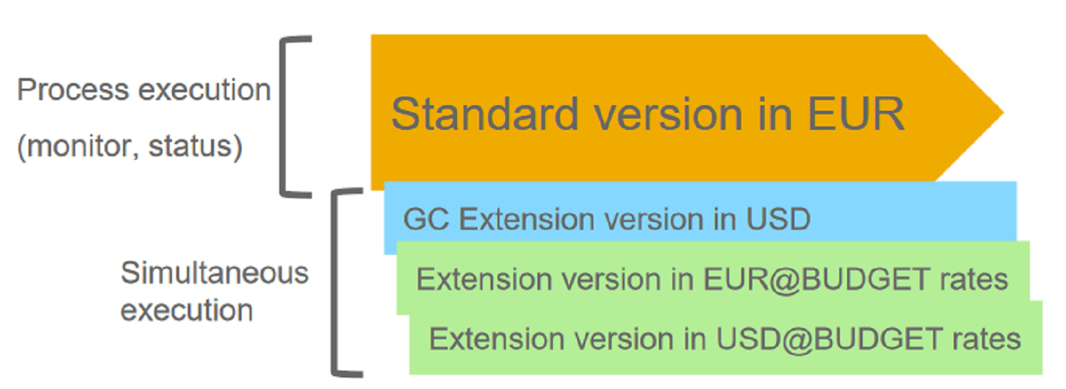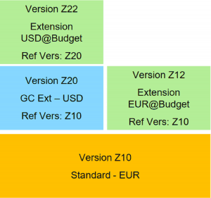 - Es ist möglich, dass Sie Erweiterungsversionen zur Standardversion konfigurieren, die jeweils eine zusätzliche Konzernwährung oder eine zusätzliche Umrechnung enthalten können.