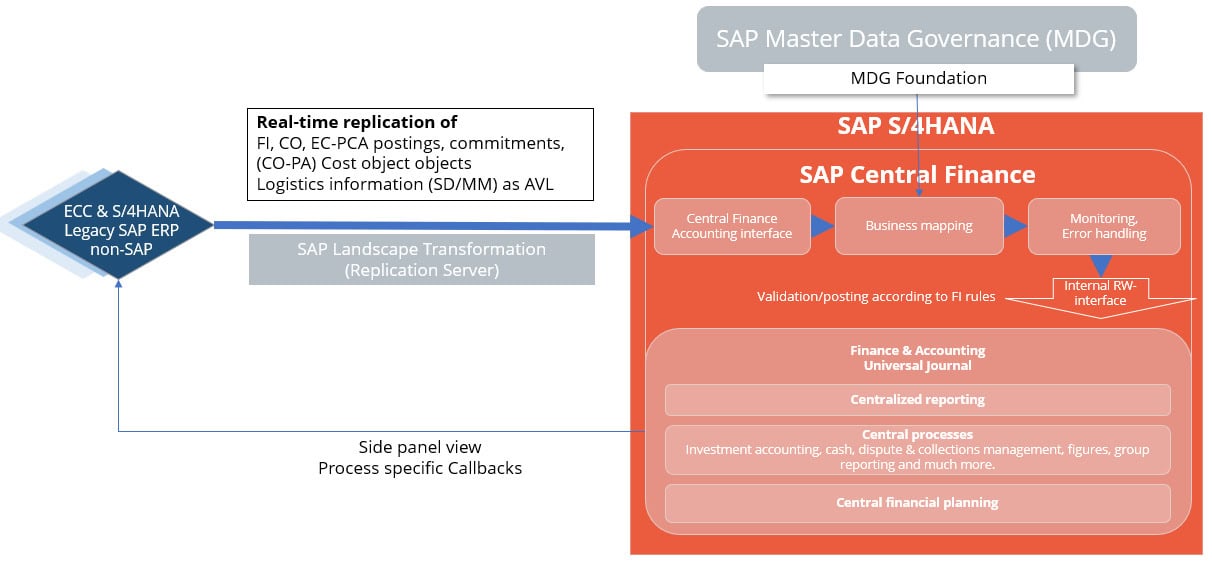 SAP Central Finance, or SAP CFIN for short, is an SAP S/4HANA solution that enables real-time replication of financial data from heterogeneous transactional SAP and non-SAP systems, thus implementing modern, centralized financial processes. SAP Central Finance thus offers the opportunity to accelerate the SAP S/4HANA transformation with regard to financial processes. It also enables the centralization of financial processes, even within a permanently or long-term complex system landscape.