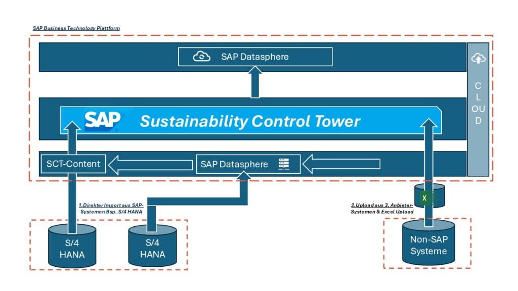 Data can be loaded directly into the SCT from SAP legacy systems such as S/4HANA, either by using existing SCT content packages or through upstream modeling in SAP Datasphere. The SCT also allows uploads from non-SAP systems via Excel uploads or interfaces.