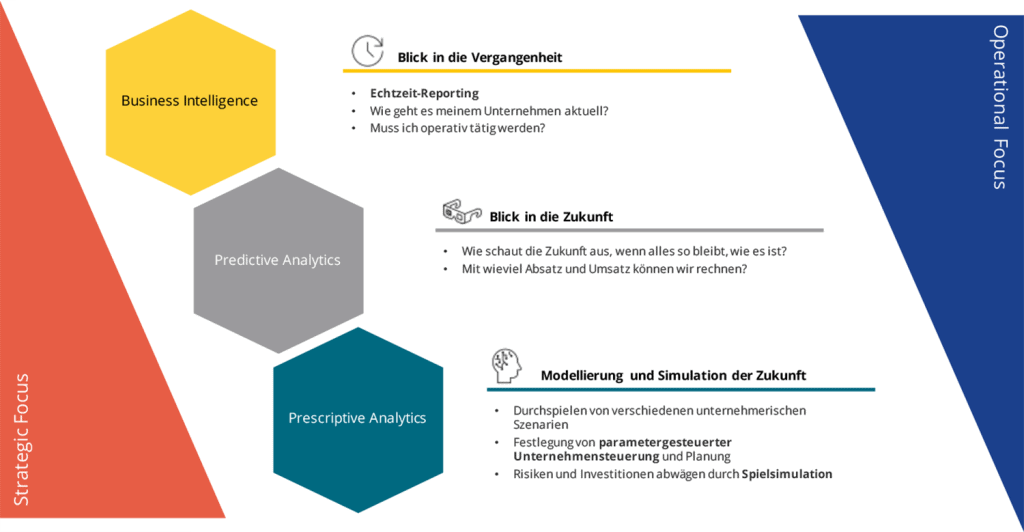 • Business Intelligence – das klassische Reporting, der Blick in die Vergangenheit